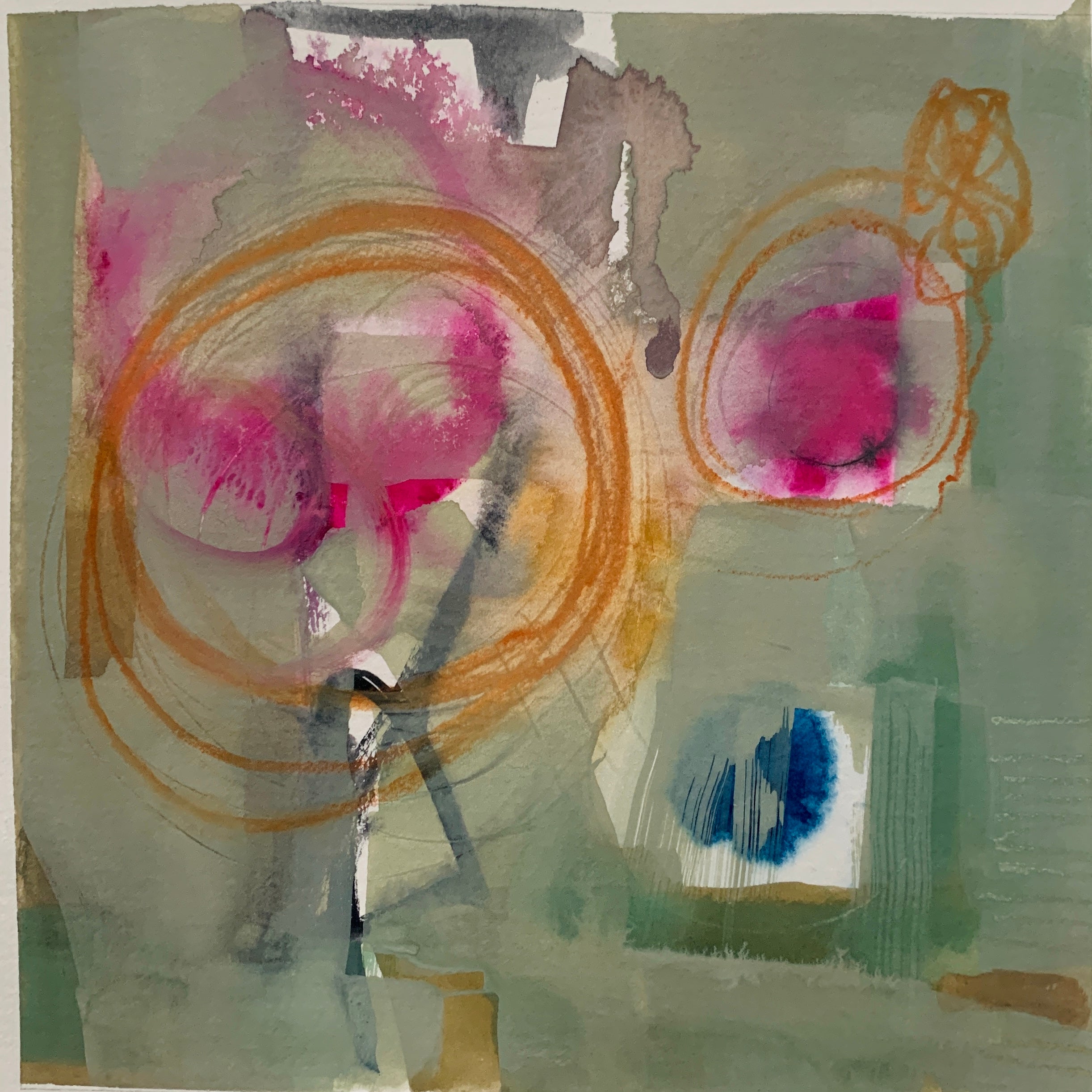 I find ultimate freedom in abstract expressionism and as such, I’m in search of the best way to convey who I am at the moment of creating. It is not to say it is a free-for-all; there is still structure within. I implement the same principles that realist painters employ with the absence of representation: composition, hierarchy, variety, juxtaposition are vital to a successful painting. But I do not limit myself to one medium or the other. I work in oil, acrylics and gouache and depending on what I’m exploring at the time I will choose one or more to express it. I also explore through a combination of paint and collage. It is through all of these various methods and mediums that I am able to share my fullest expression of self and my authenticity. My paintings ultimately are self portraits that are created from both past experiences and also future hopes and dreams. It is my goal to invoke a feeling for the viewer. When it does I have succeede