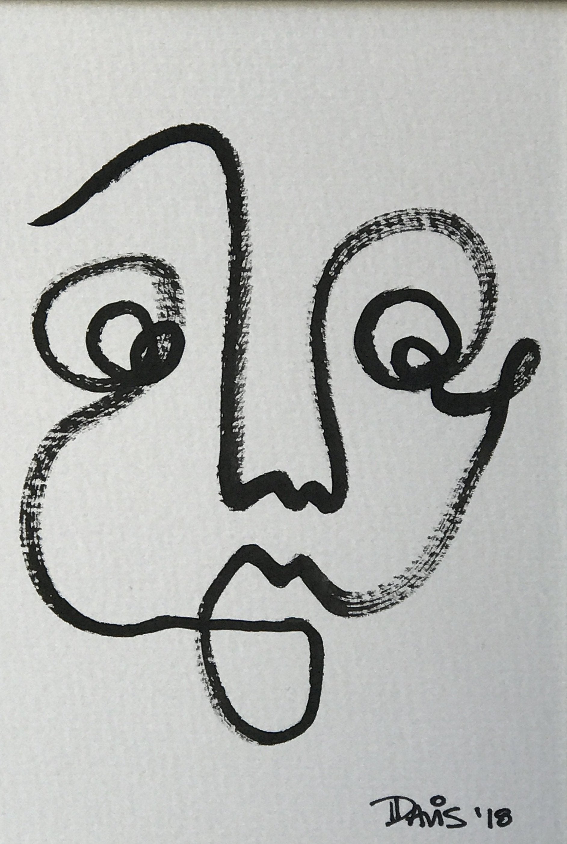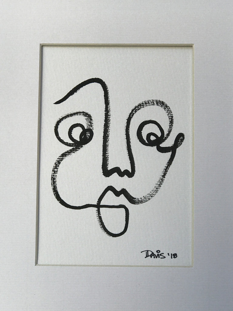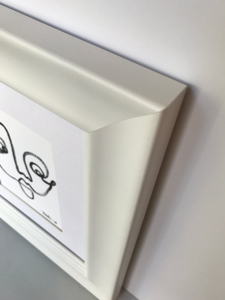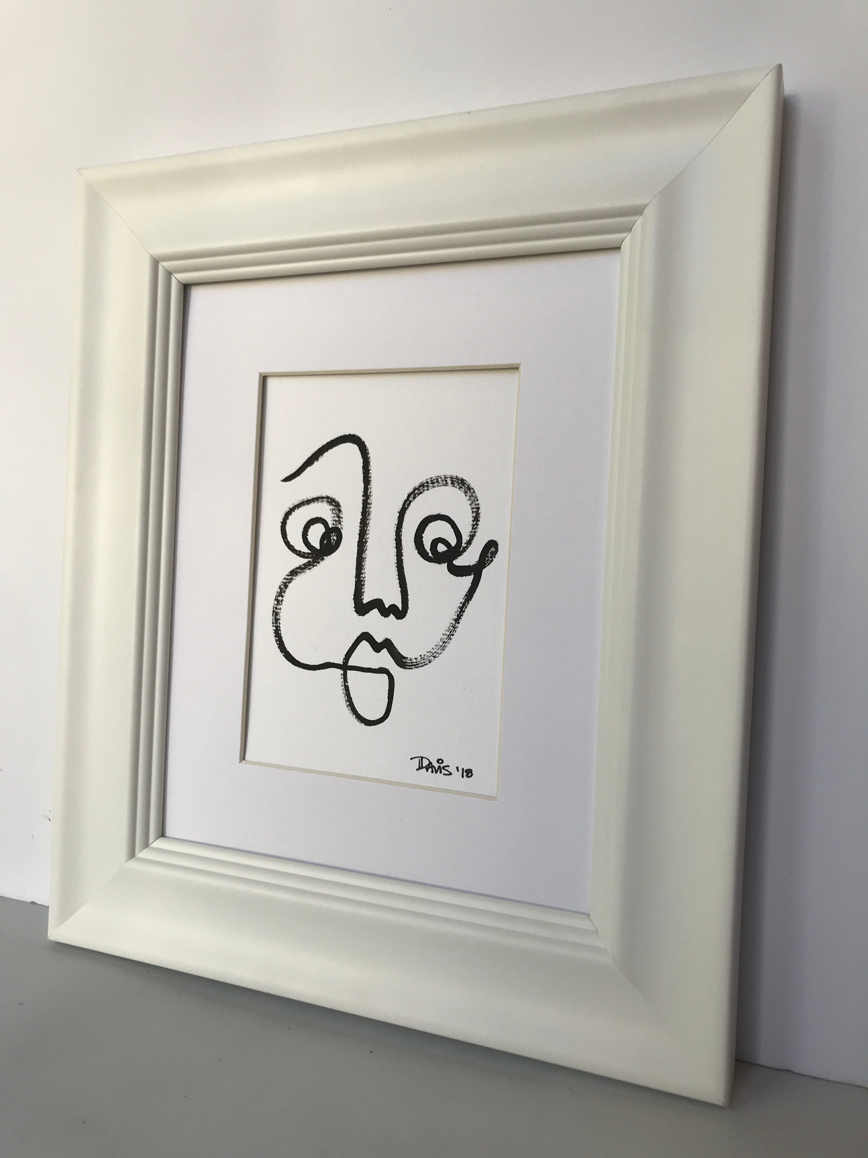 black ink on white 140lb watercolor paper, matted and framed in white frame