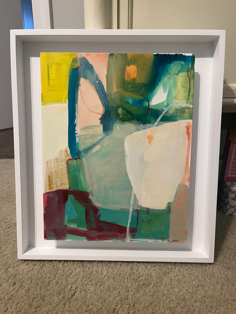 acrylic on paper, mounted in white floater frame