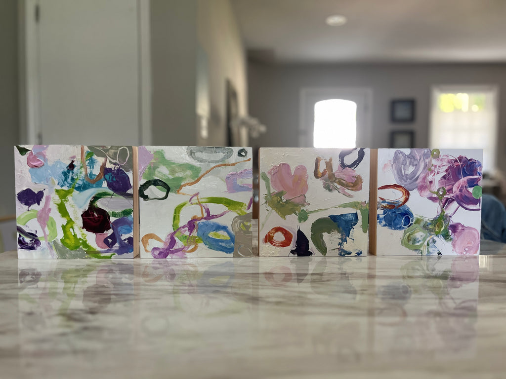 I find ultimate freedom in abstract expressionism and as such, I’m in search of the best way to convey who I am at the moment of creating. It is not to say it is a free-for-all; there is still structure within. I implement the same principles that realist painters employ with the absence of representation: composition, hierarchy, variety, juxtaposition are vital to a successful painting. But I do not limit myself to one medium or the other. I work in oil, acrylics and gouache and depending on what I’m exploring at the time I will choose one or more to express it. I also explore through a combination of paint and collage. It is through all of these various methods and mediums that I am able to share my fullest expression of self and my authenticity. My paintings ultimately are self portraits that are created from both past experiences and also future hopes and dreams. It is my goal to invoke a feeling for the viewer. When it does I have succeede