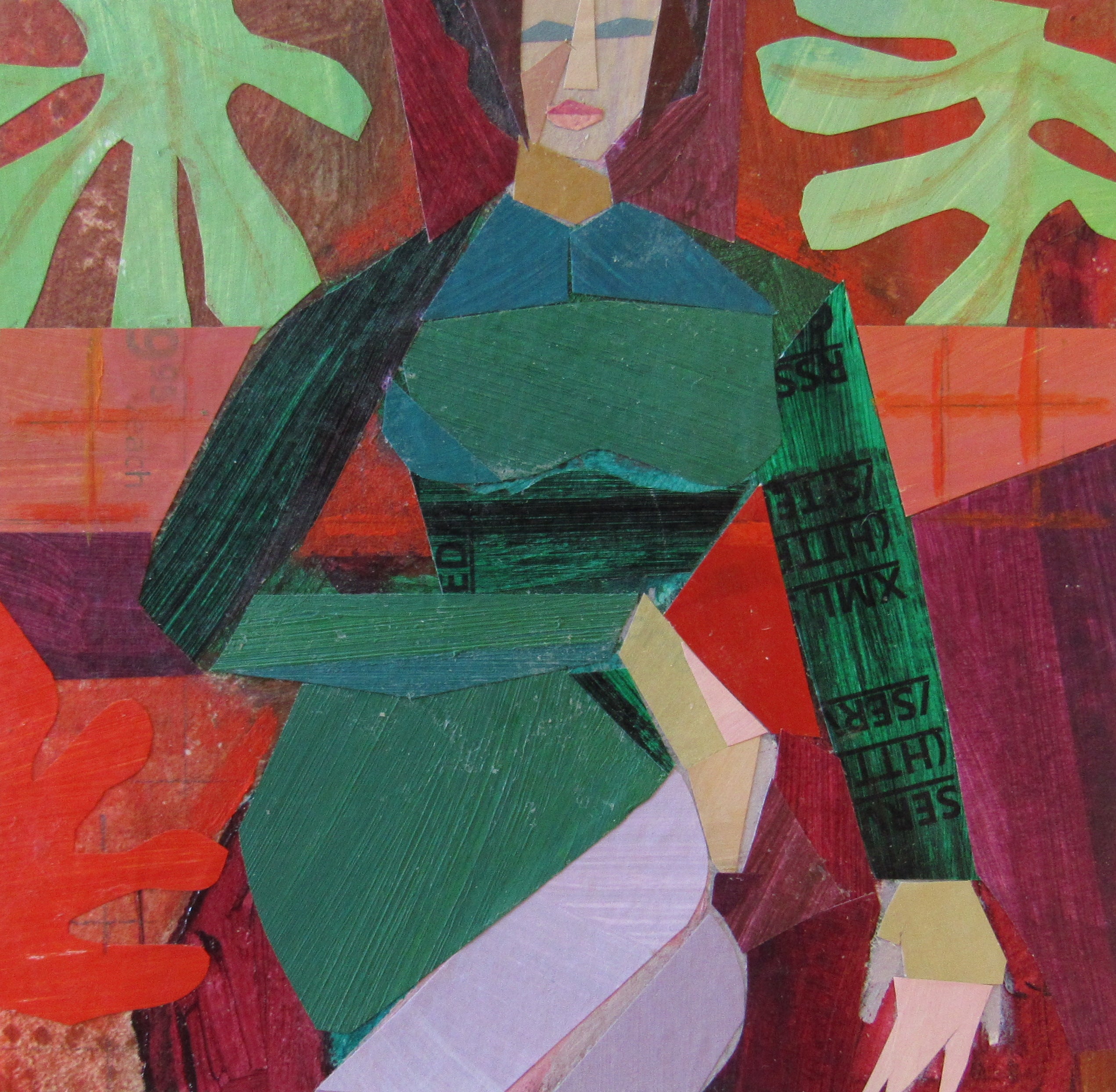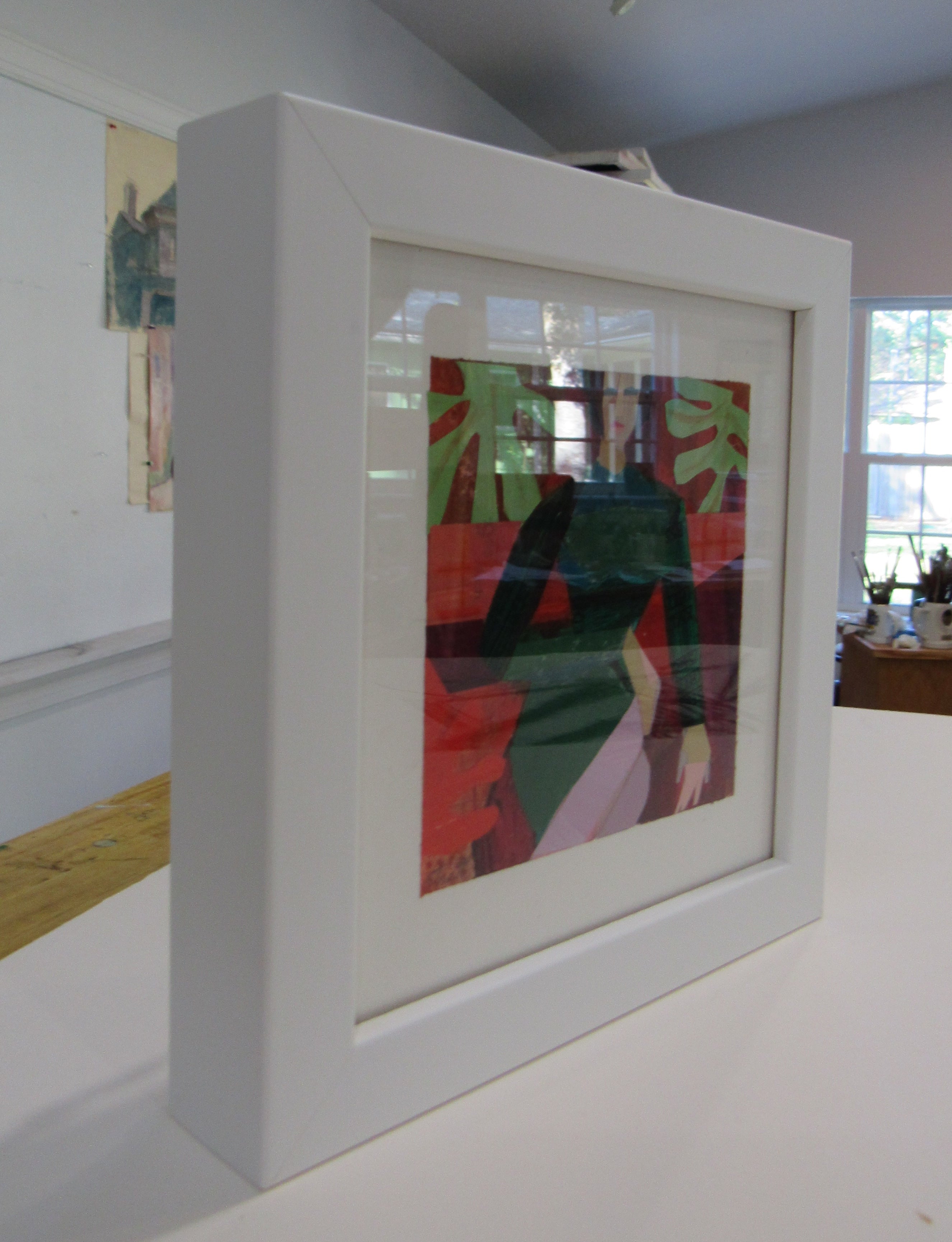 collage on paper, framed in white frame