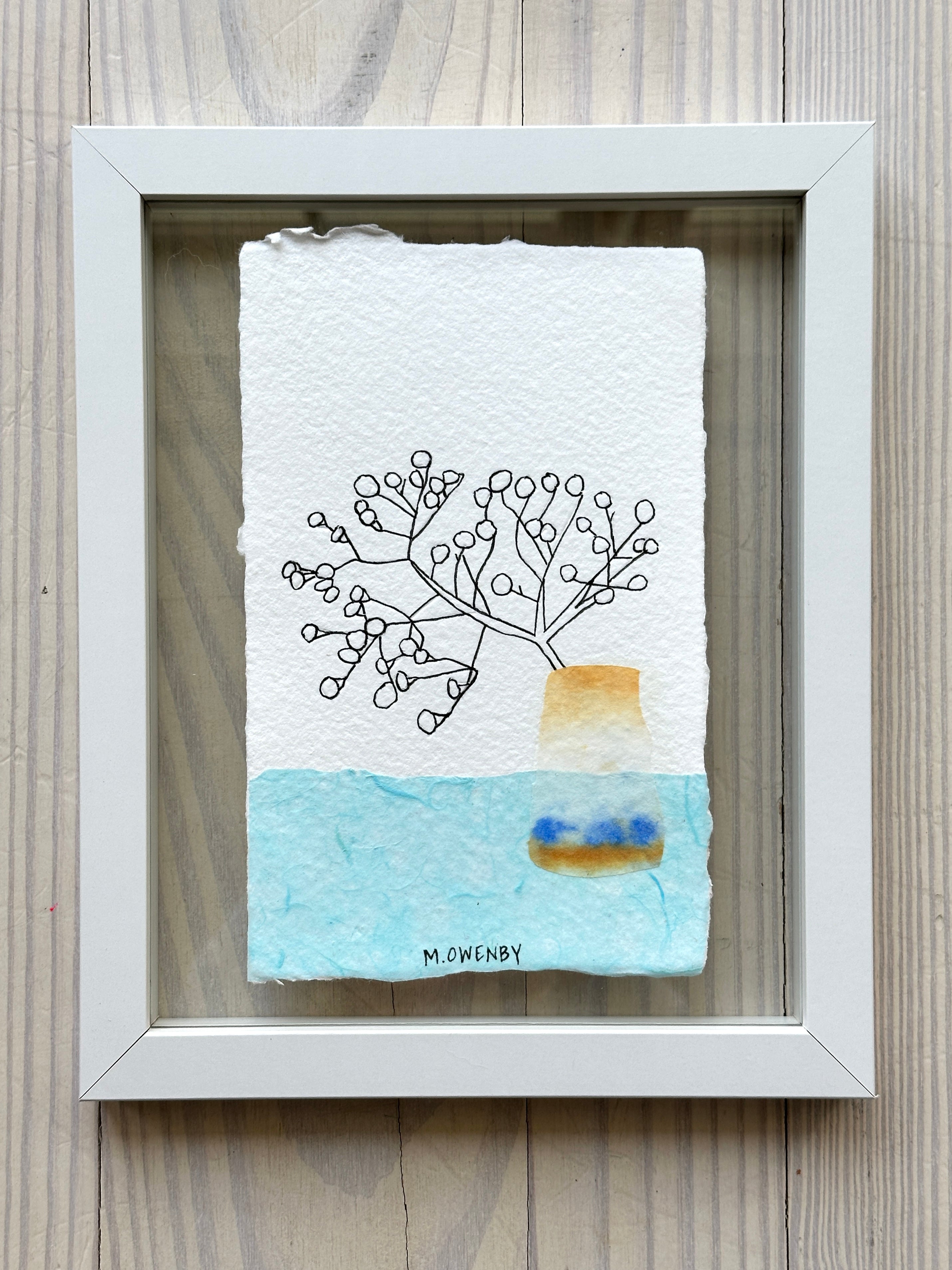 Mixed Media ink and collage on deckled edge paper in white wood float frame