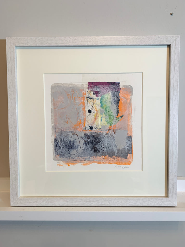 layered monotype acrylic on paper, in whitewashed wood frame