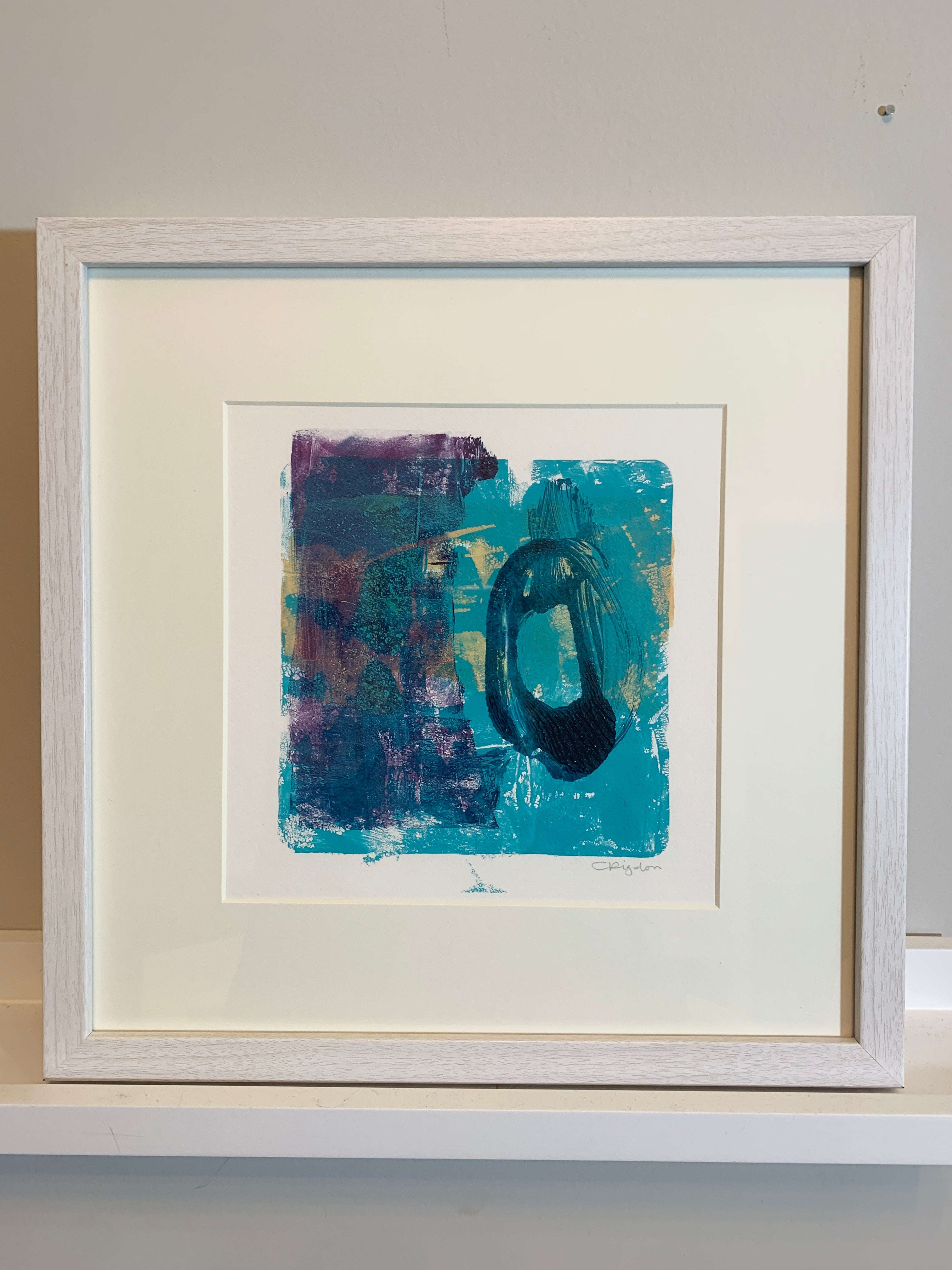 layered monotype acrylic on paper, in whitewashed wood frame