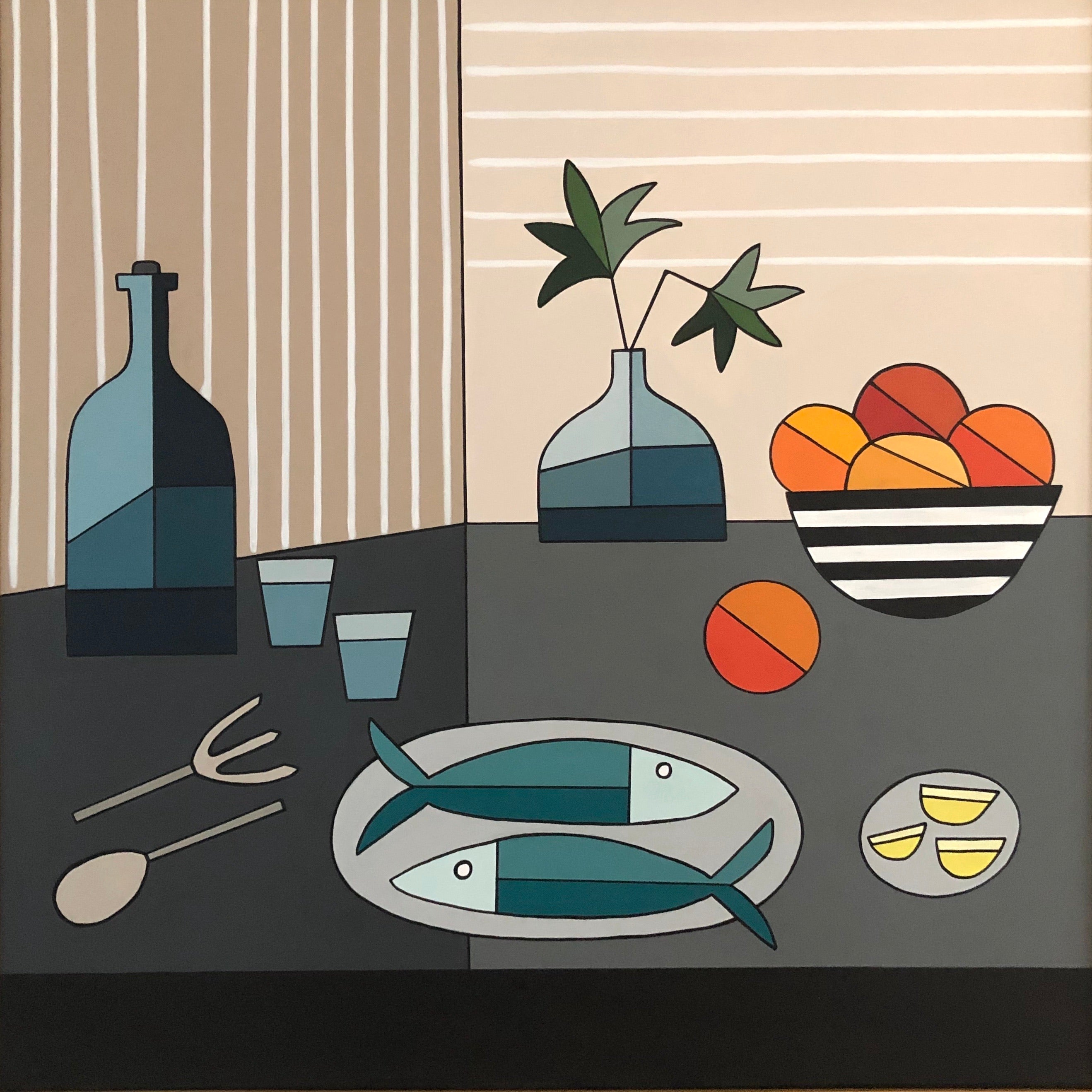 Cindy DeAntonio is a mixed media artist who uses distinct lines and shapes to create her unique and highly recognizable style. Her work is comprised of abstracts, modern interpretations of traditional lowcountry landscapes, and cubist inspired still lifes. She draws inspiration from a variety of sources including fashion, design and her natural surroundings. Cindys love of bold colors and balance are apparent in each one of her pieces. Her work have been featured in Coastal Living, Serena and Lily, Garden and Gun, and SIP magazine. Cindy grew up in Columbia, South Carolina and earned a Studio Art degree from the University of South Carolina. She currently lives on Isle of Palms, SC with her family.