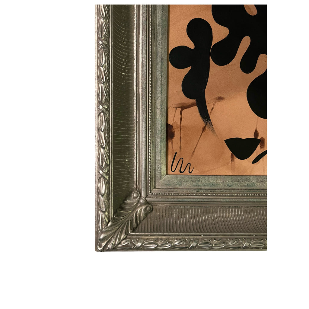 acrylic on tea-stained cold press paper, custom framed in antique ornate brushed silver frame, with UltraVue Anti-Reflection PlexiGlass