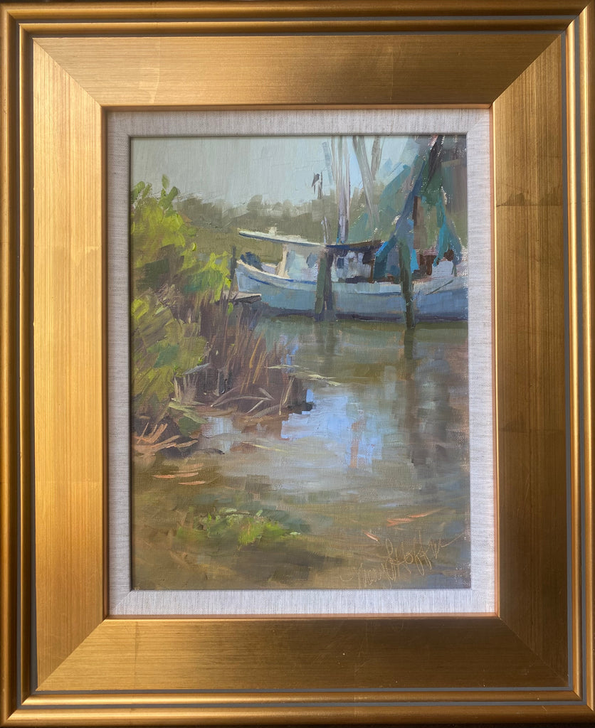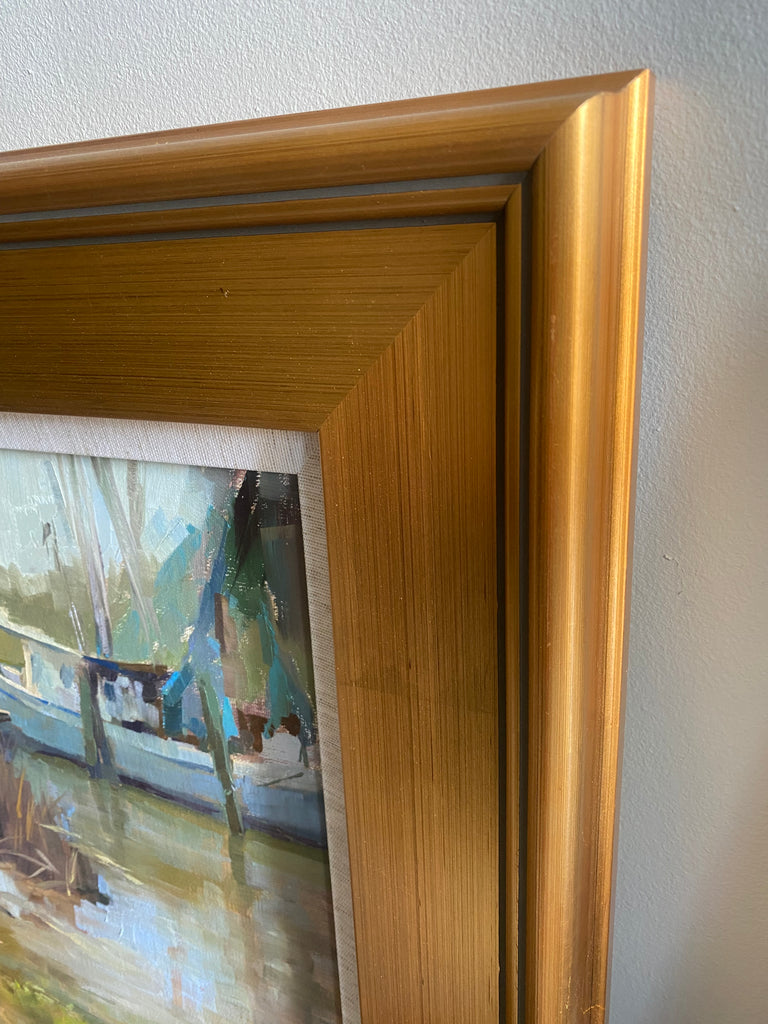 oil on Belgian linen panel, in gold floater frame with linen lining