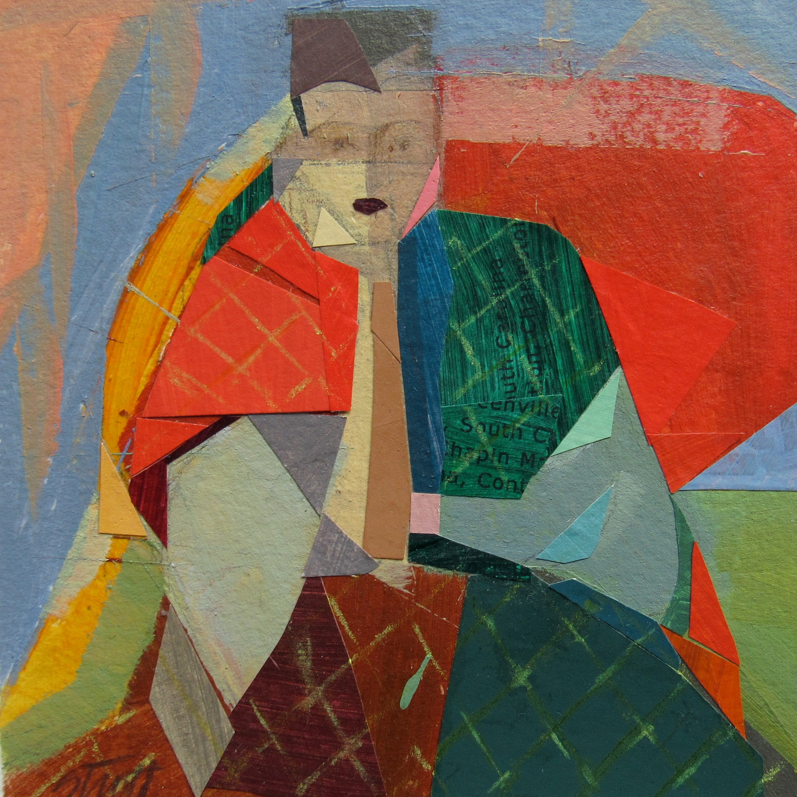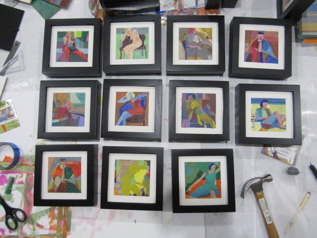 collage on paper, framed in black frame