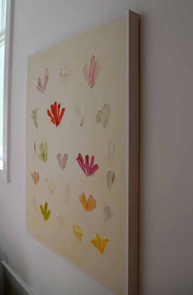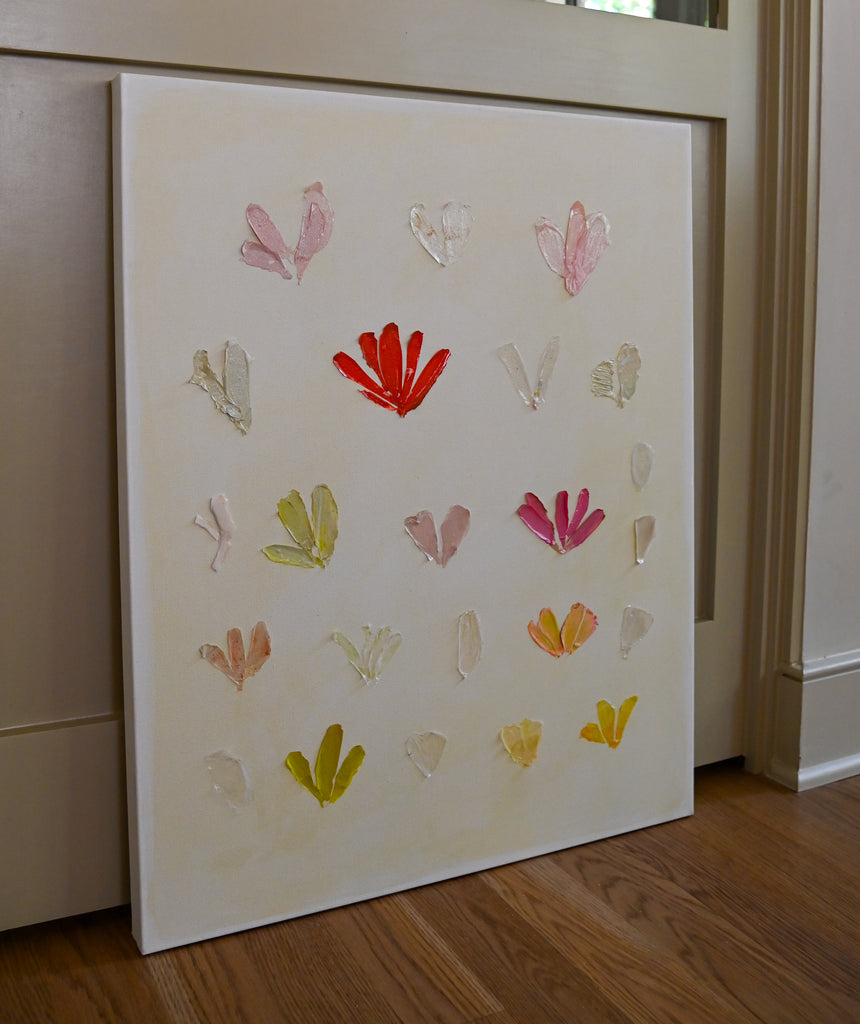 If Diana had a personal motto it would be “everything can be a treasure hunt if you try hard enough.” Growing up in Baton Rouge, Louisiana, Diana was fully trained in the art of the hunt by her mother who would drop all plans at the glimmer of an “Estate Sale Today” sign. Fortunately, this past time led to the ultimate find of a library of art and painting books which sent her in to a rabbit hole of learning about theories, lines, composition, and color that she hasn’t looked back from since. After years of self-study and practice, Diana launched her first collection to the public in fall of 2020. Her first series entitled “The Butterfly Collection” is built upon layers of color, glazers and washes carefully balanced to find the calm in the chaos. Diana names each piece after her favorite inspirational influences from authors to beaches to everyday people in her life that constantly bring her back to awe and wonder. Diana resides in Mount Pleasant, South Carolina with her husband Gabe, and her three boys Dixon, Charles, and Henry. If you are in the area and see a girl with paint chips on her hand digging for shells in the beach or through a stack of books in front of the library, please say hello!