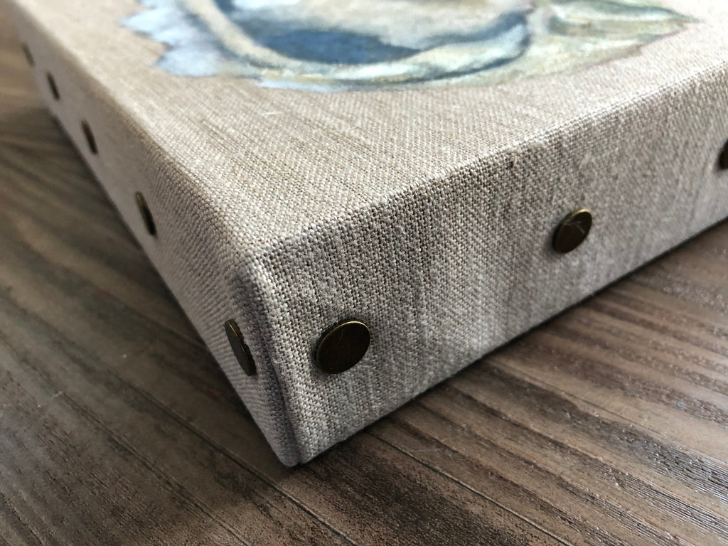 oil on natural linen, brass tacks along the canvas edge