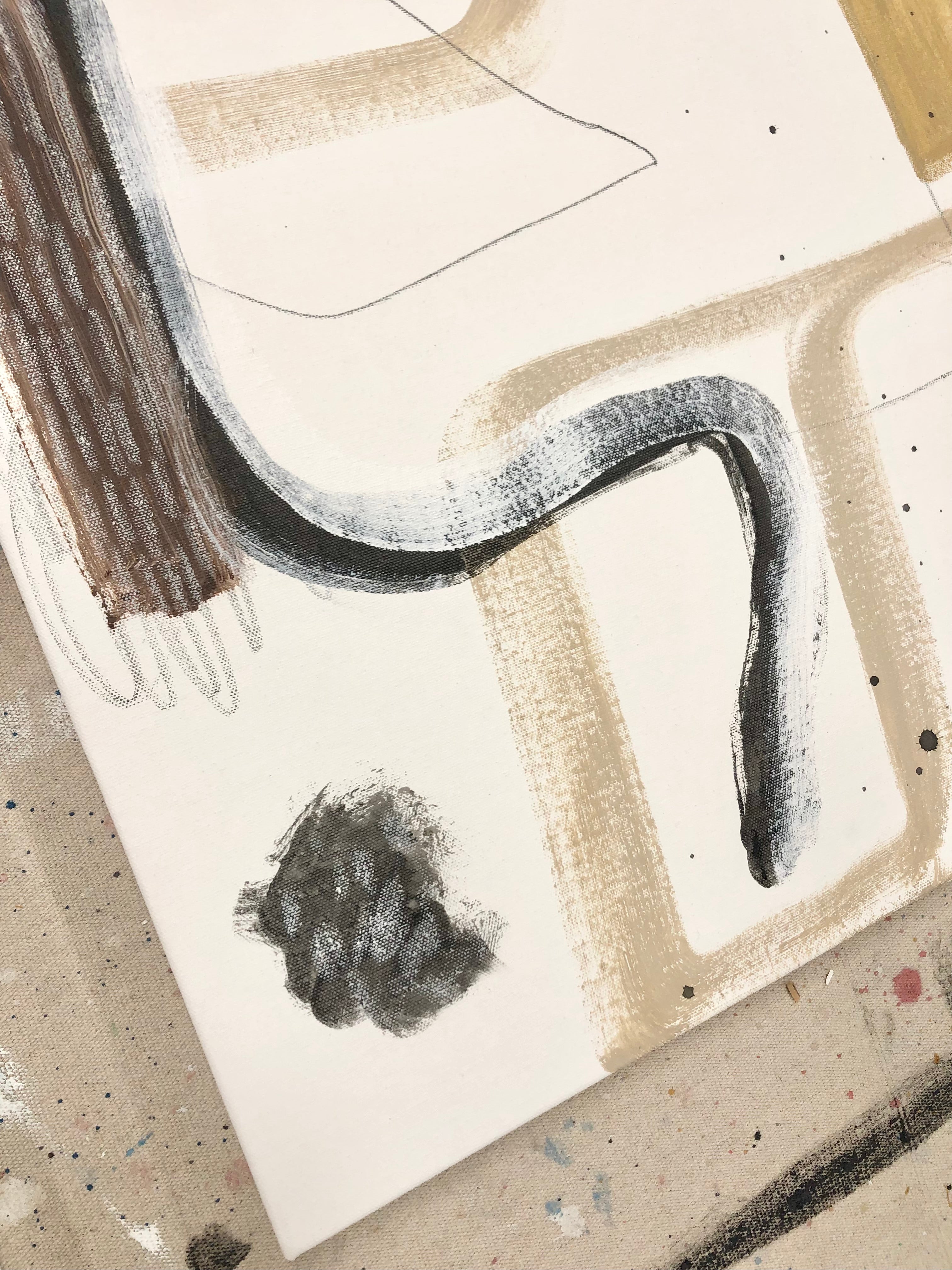 Brian Coleman received his degree in graphic design from the art institute of charlotte. “I begin my process with loosely drawing and exploring the freedom of gesture. It’s kind of like watching a bird soar, you don’t know if it will glide left, bend right, sail up or down.” Alternating between fluid and structured gestures undoubtedly reveals how Brian makes sense of the world as he moves through it. Coleman draws from a vast library of his free drawings to produce these layered creations that groove, and flow punctuated by color, line and forms that bring the rhythm of the painting to life. The images are pieces and parts of the past, present and future, in the process of becoming something else. The works become stories of their own, they come together to become another place in time. “I am never arriving at a place, and I am constantly using my pieces and parts in the process of a journey that never ends.”