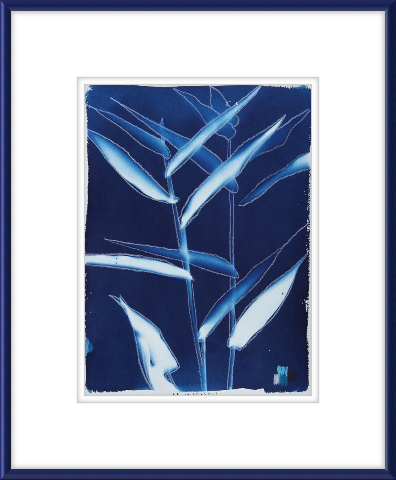 hand embellished cyanotype on paper, double matted, in rounded blue metal frame