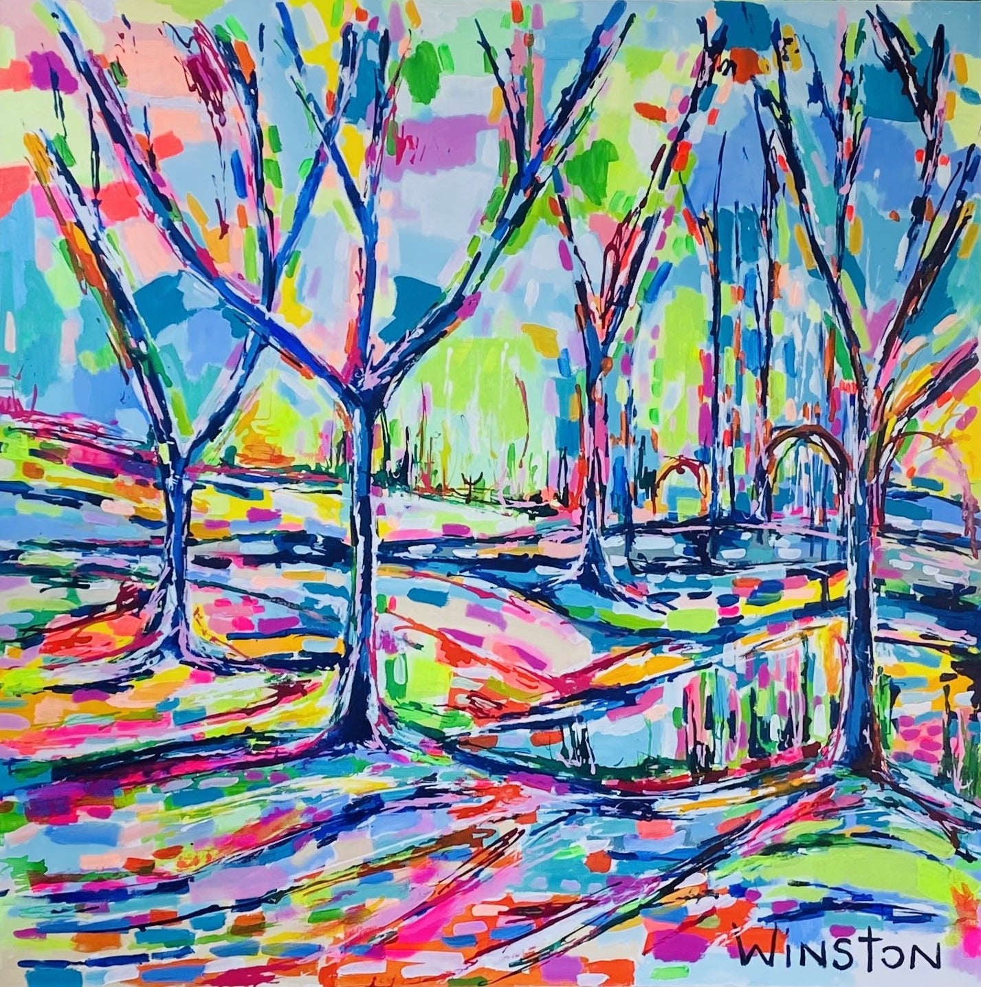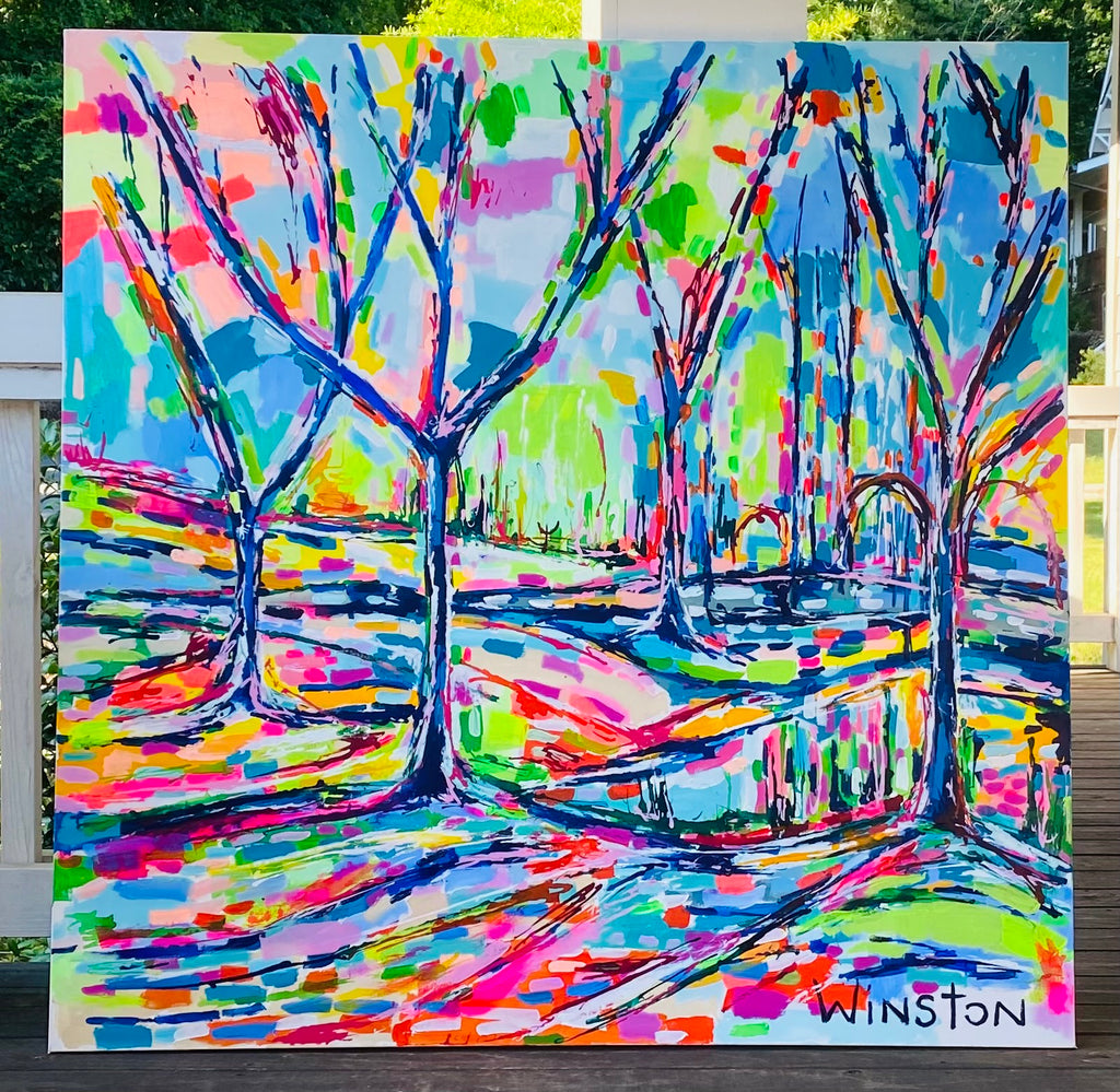 Winston Wiant is originally from Amelia Island, Florida, and full of southern charm. She brings her whimsical and witty delight to each and every painting. Having painted since childhood, she received a Bachelor of Arts degree in Studio Art at Brenau University and has been pursuing her love of art ever since. Her paintings are full of texture, using the palette knife and free brushstrokes to layer the paint, creating one energetic piece after another. She lives in Athens, GA, with her husband and two daughters and paints in her home studio. “Art to me is a form of self-expression. The way I feel that day reflects in my work. My love of bold color and texture is both distinctive and captivating.”