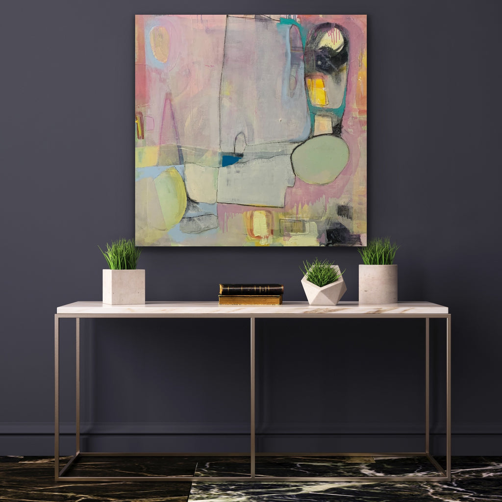 I find ultimate freedom in abstract expressionism and as such, I’m in search of the best way to convey who I am at the moment of creating. It is not to say it is a free-for-all; there is still structure within. I implement the same principles that realist painters employ with the absence of representation: composition, hierarchy, variety, juxtaposition are vital to a successful painting. But I do not limit myself to one medium or the other. I work in oil, acrylics and gouache and depending on what I’m exploring at the time I will choose one or more to express it. I also explore through a combination of paint and collage. It is through all of these various methods and mediums that I am able to share my fullest expression of self and my authenticity. My paintings ultimately are self portraits that are created from both past experiences and also future hopes and dreams. It is my goal to invoke a feeling for the viewer. When it does I have succeede
