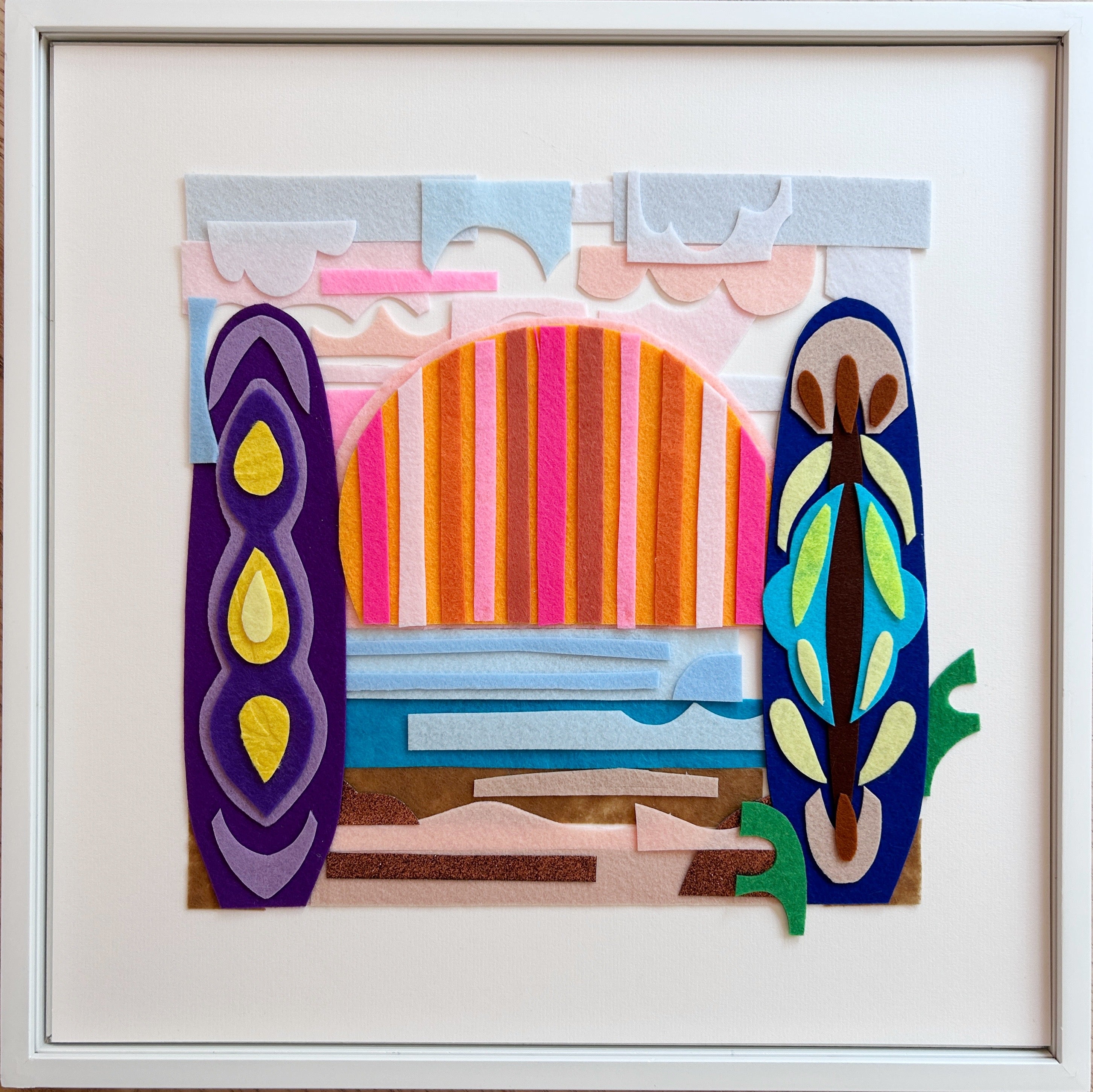 Sam Sidney is originally from New York, and moved to Charleston in 2007. She studied Studio Art at Skidmore College in Saratoga Springs, and earned a Masters in Art Education from NYU. For many years she was an illustrator, but it wasn’t until the quarantine that she started working with felt. She promised herself she would do an art project with her kids each day. One day, she pulled out a small box of felt and made some collages. She made a self portrait out of felt, posted it online, and the rest is history! She free hand cuts felt pieces to create protists of celebrities, pets, food and drinks. When she is not making things out of felt, you can find her at the beach with her 4 kids and 2 dogs.