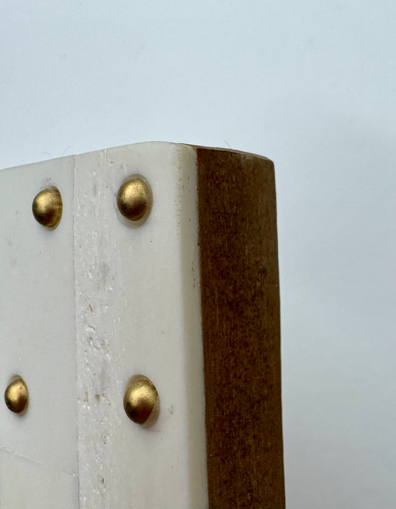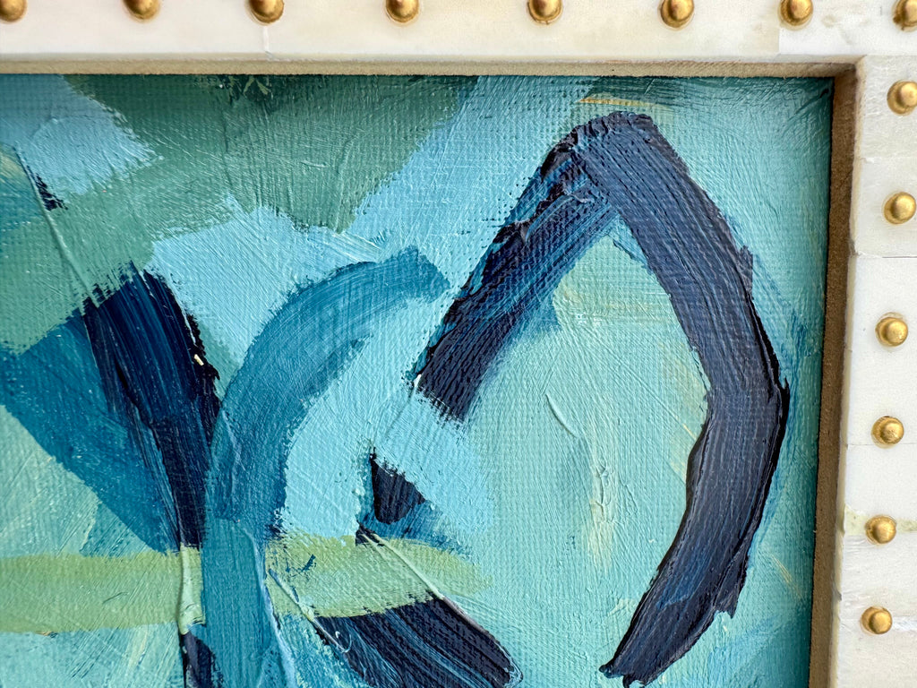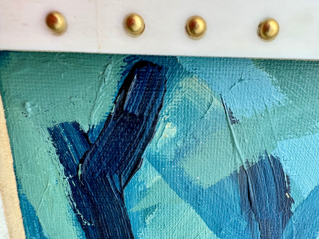 acrylic on canvas panel in bone and brass studded frame