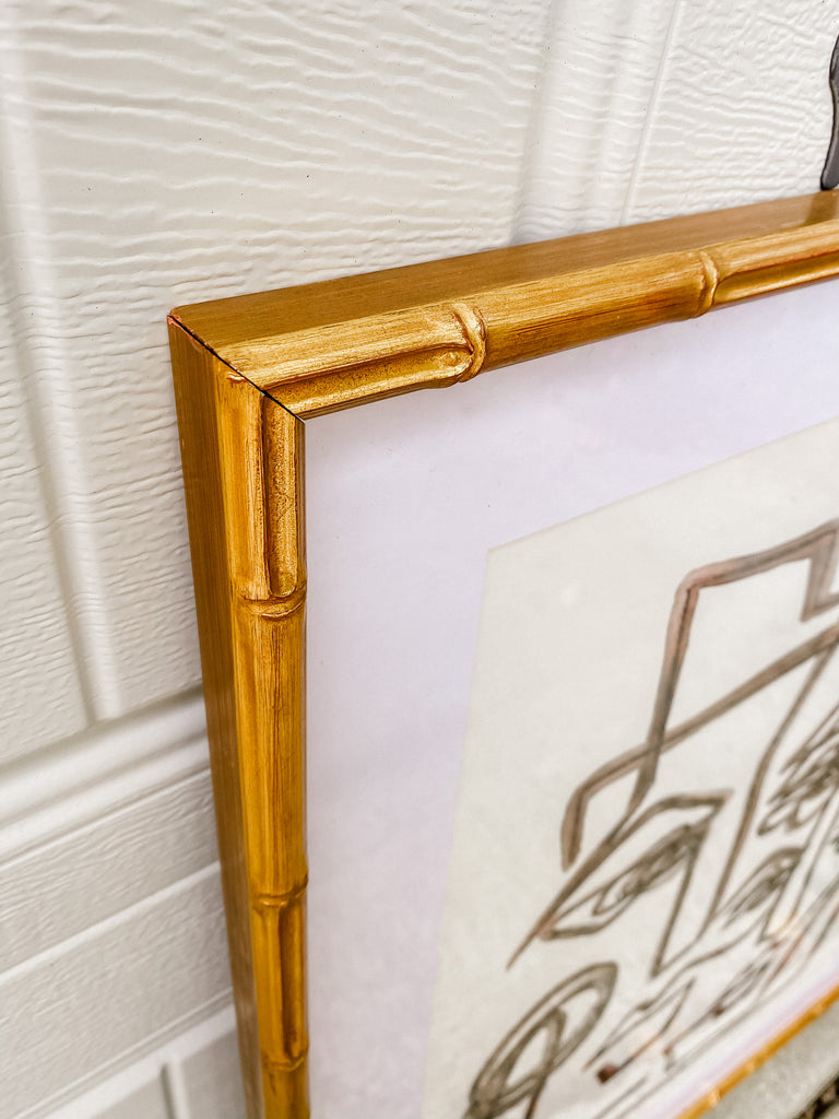 ink, watercolor and charcoal on paper, in gold faux bamboo frame