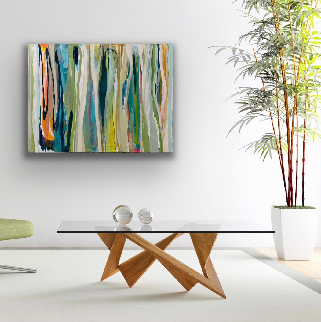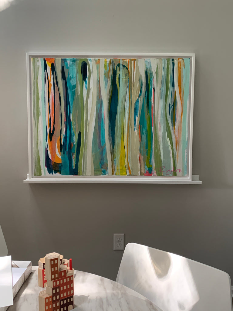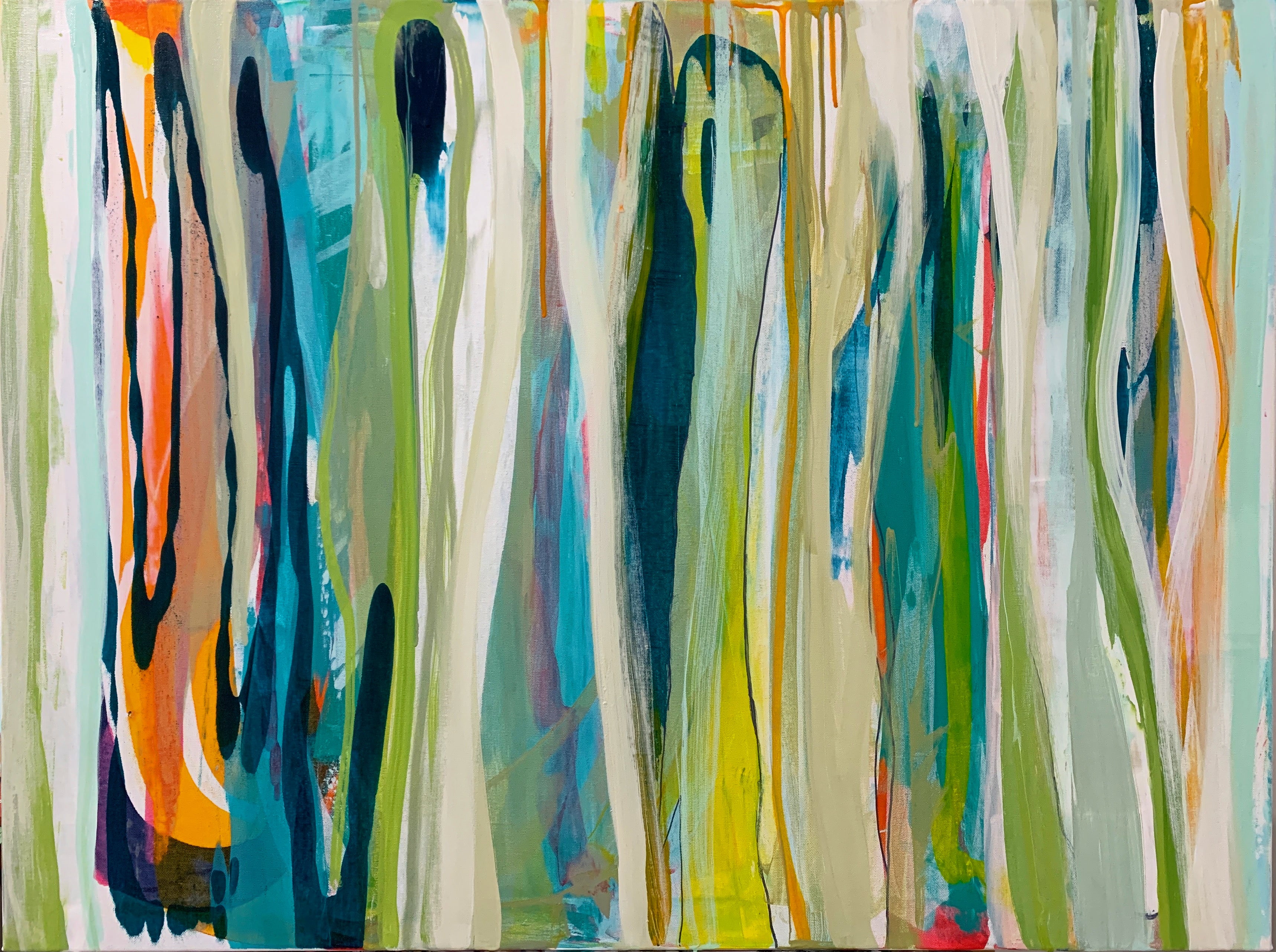 I find ultimate freedom in abstract expressionism and as such, I’m in search of the best way to convey who I am at the moment of creating. It is not to say it is a free-for-all; there is still structure within. I implement the same principles that realist painters employ with the absence of representation: composition, hierarchy, variety, juxtaposition are vital to a successful painting. But I do not limit myself to one medium or the other. I work in oil, acrylics and gouache and depending on what I’m exploring at the time I will choose one or more to express it. I also explore through a combination of paint and collage. It is through all of these various methods and mediums that I am able to share my fullest expression of self and my authenticity. My paintings ultimately are self portraits that are created from both past experiences and also future hopes and dreams. It is my goal to invoke a feeling for the viewer. When it does I have succeede