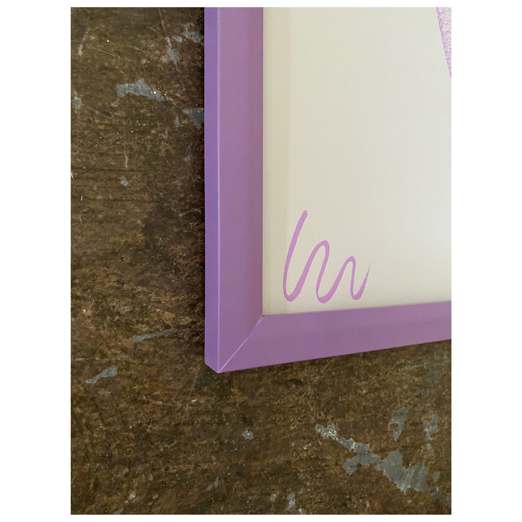 acrylic on paper, in lavender frame with museum glass