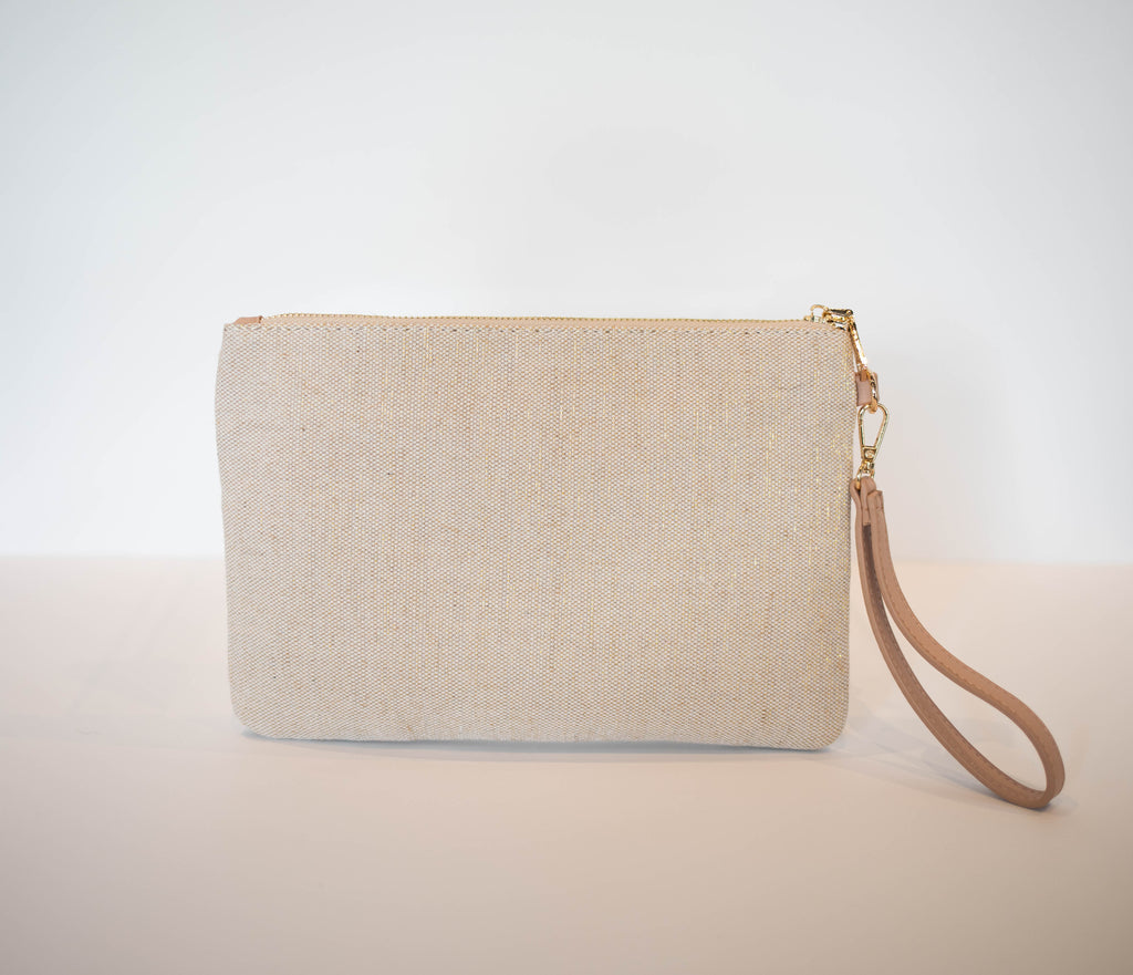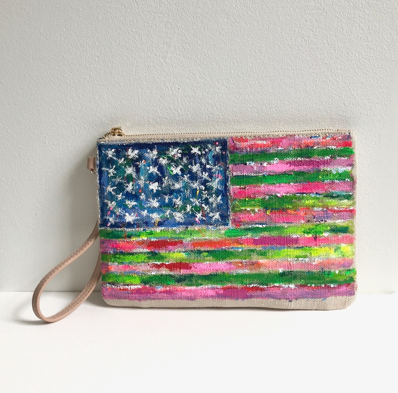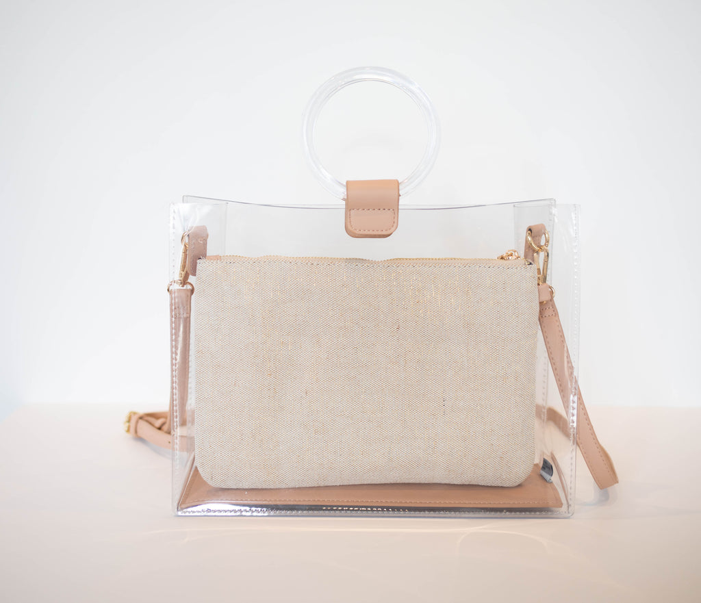 hand painted canvas clutch with clear tote bag with adjustable, cross-body strap